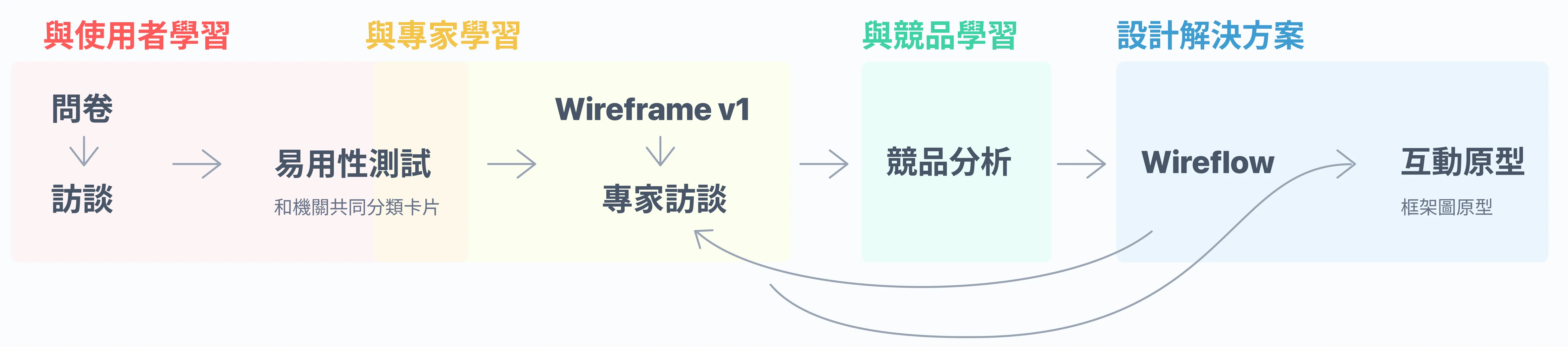 設計分析與策略、用戶訪談、流程梳理、Wireflow、Prototyping
