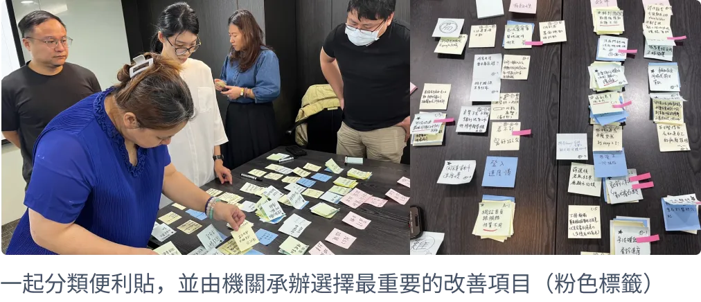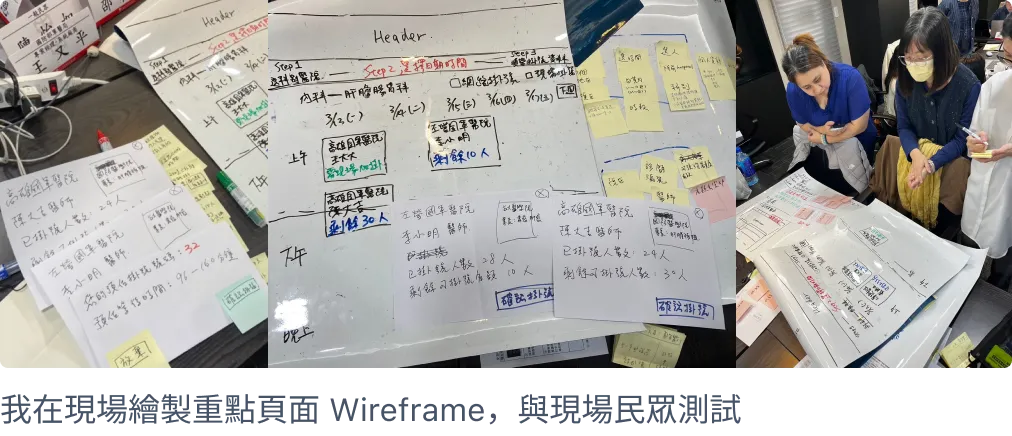 我們與利害關係人透過工作坊,在現場與民眾進行既有系統的易用性測試,以便利貼紀錄每個頁面痛點後,根據「有效性、效率、滿意度」原則進行歸納,總結出最需要解決的頁面問題。並在當天針對重點頁面,快速迭代兩版 Wireframe,在當場進行測試。