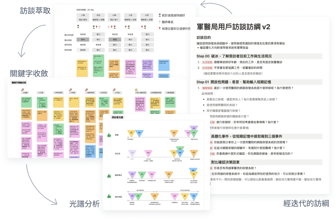 透過問卷填答狀況,由 PM 進行狩野分析後,我們決定將訪談聚焦在國軍醫院的主要使用者:「軍警消人員」。我負責規劃訪綱,並在 5 場訪談後進行萃取,總結出的研究洞察是我們與利害關係人對齊專案範疇的主要依據。