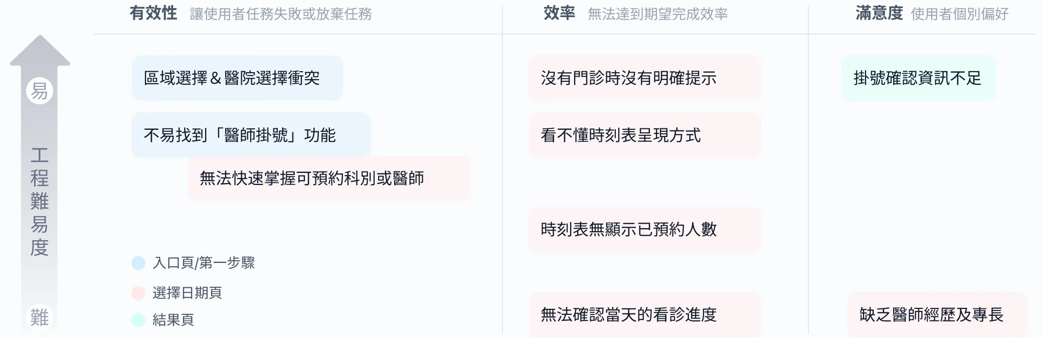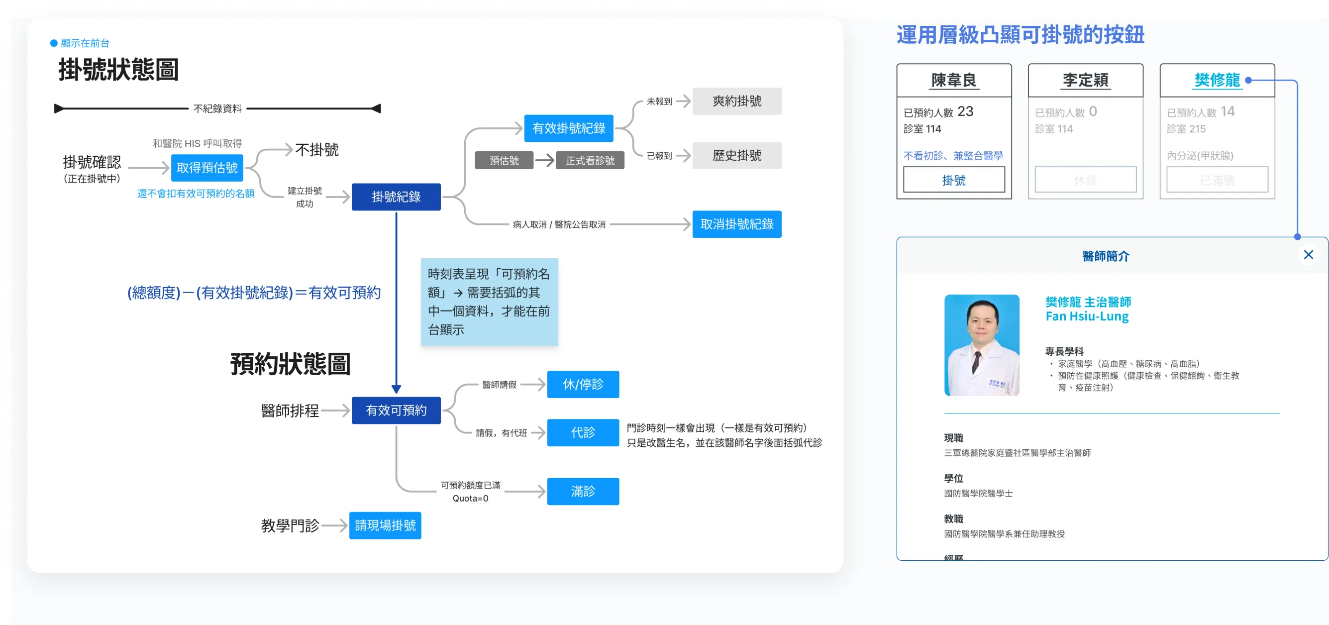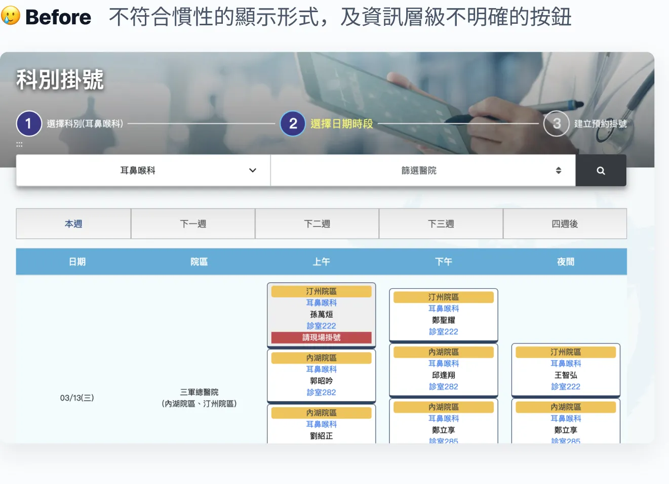原先頁面凸顯的是「不能預約」的時間,造成使用者受挫。為解決此問題,我與系統廠商進行專家訪談,確認系統的預約狀態及各狀態的意涵,將之區分成 5 個明確狀態,並在時刻表上顯示「已預約人數」及特殊的看診限制或專長,作為使用者更多判斷選擇的依據。
