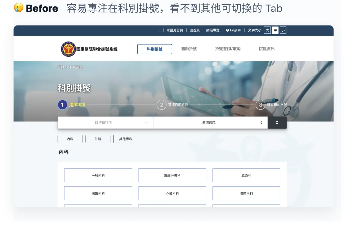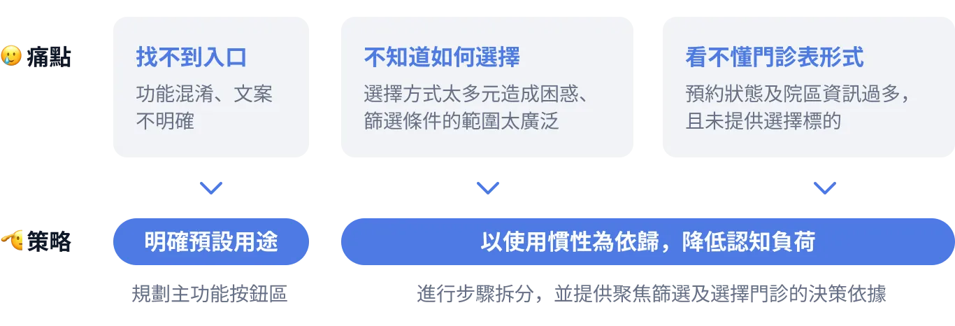 原本的入口頁以「科別掛號」為首頁,其他功能容易被忽略。因此,我將入口頁改為四個按鈕式選擇,讓使用者可以根據自己的需求快速選擇功能。