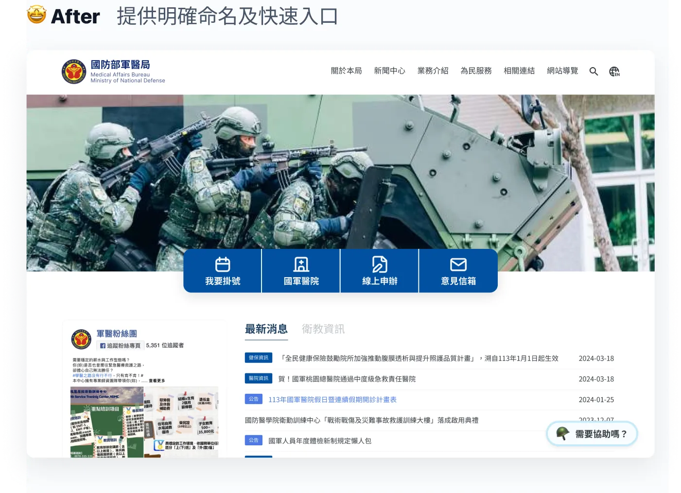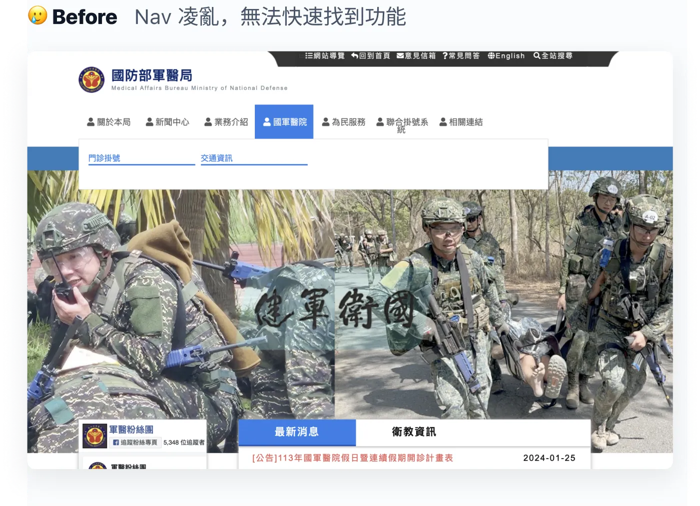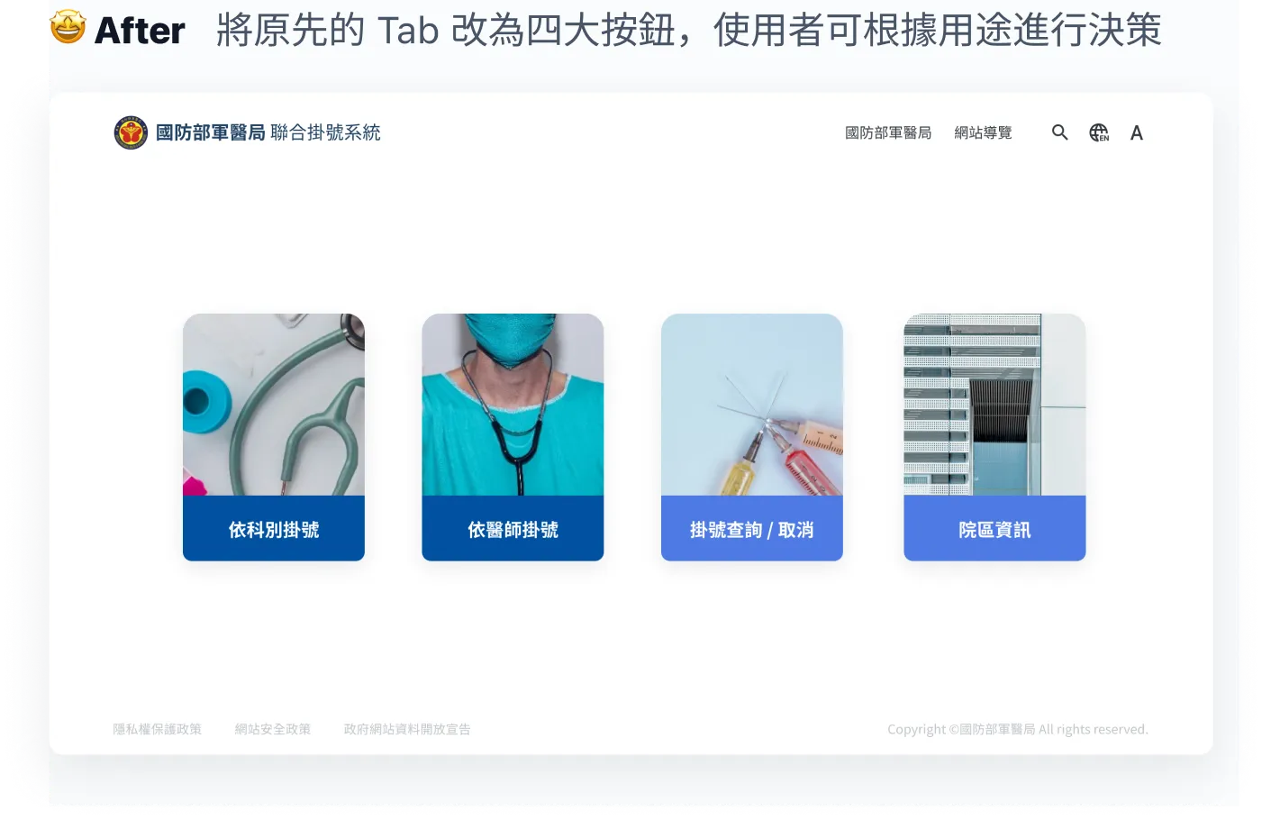 原本的「聯合掛號系統」與「國軍醫院-門診掛號」Nav 容易混淆。為了讓使用者更容易理解,我將其改以「我要掛號」的指向性動詞命名,並提取網站中的四個主要功能,放在 Banner 下方,與 Navbar 區分,以便使用者快速連結功能。
