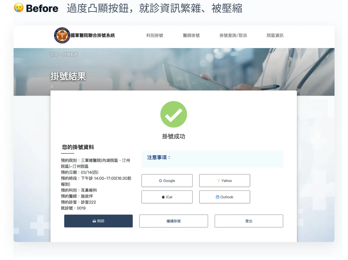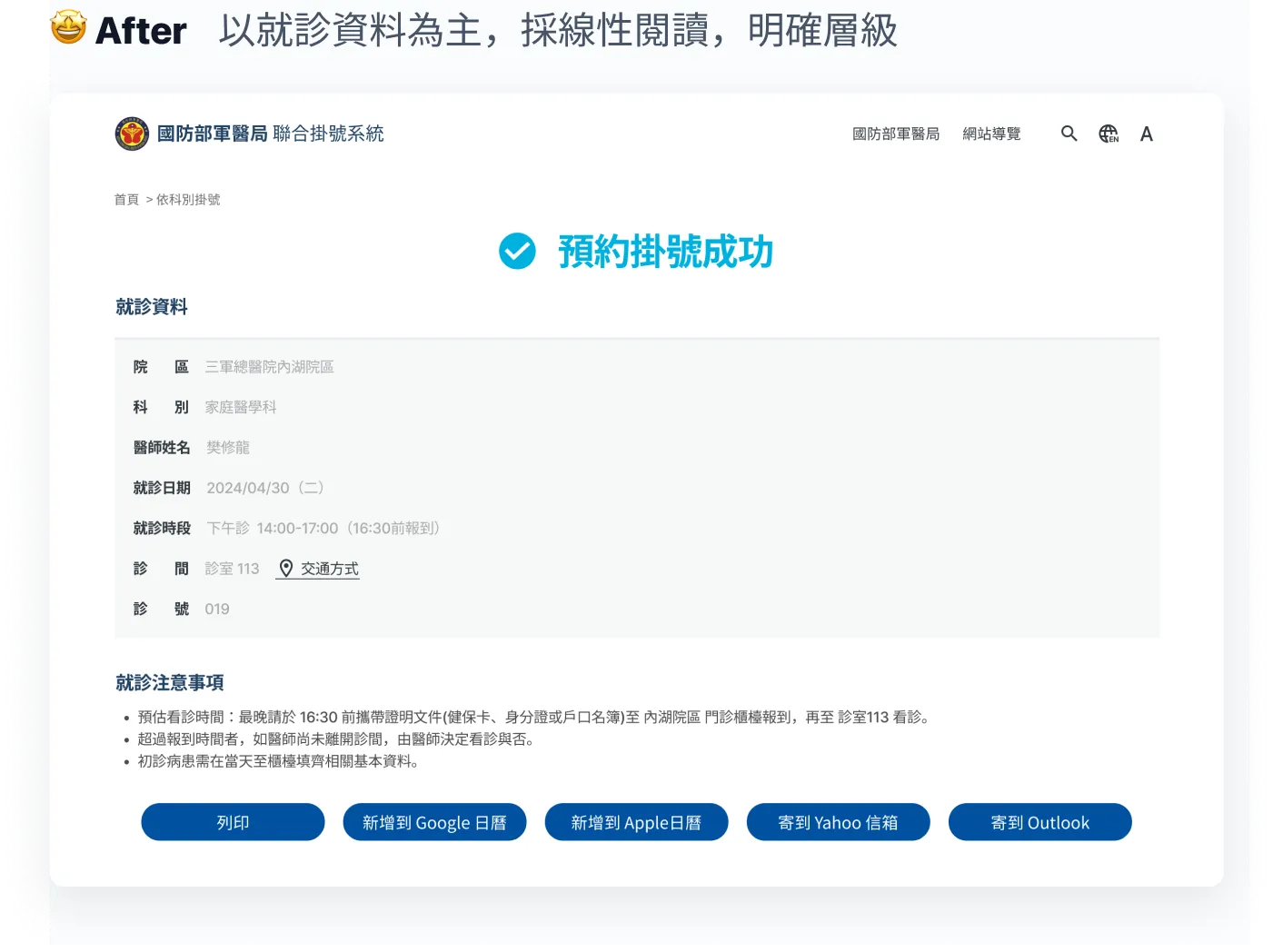 原先頁面過度凸顯按鈕,且就診資訊易讀性不足,缺乏後續就診下一步指引。我調整了介面配置,改善資訊表頭的命名,透過更明確的資訊層級和降低認知負荷的文案,讓使用者專注於確認「就診資訊」的結果。同時,提供交通方式連結,方便使用者查看交通資訊,降低就診前尋找地點、樓層的不安全感。