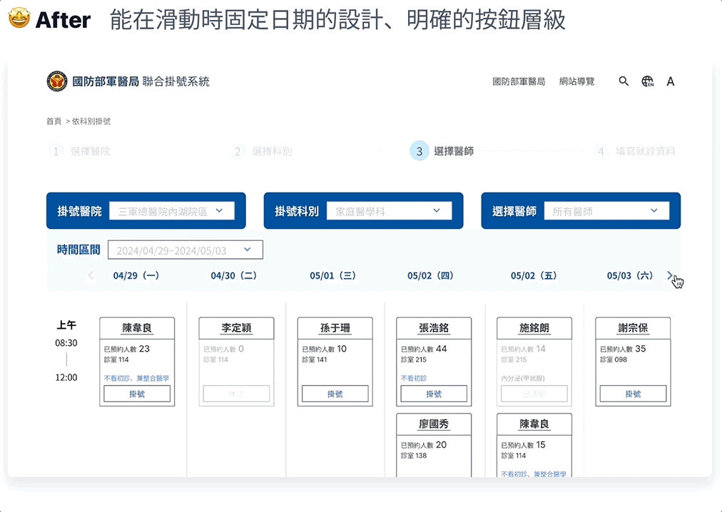 在介面設計上,我根據使用者慣性,將日期放在上方、時段放在側欄,使用者能更輕鬆地根據日期尋找適合的門診,並使介面適應長頁面及手機版的瀏覽情境。