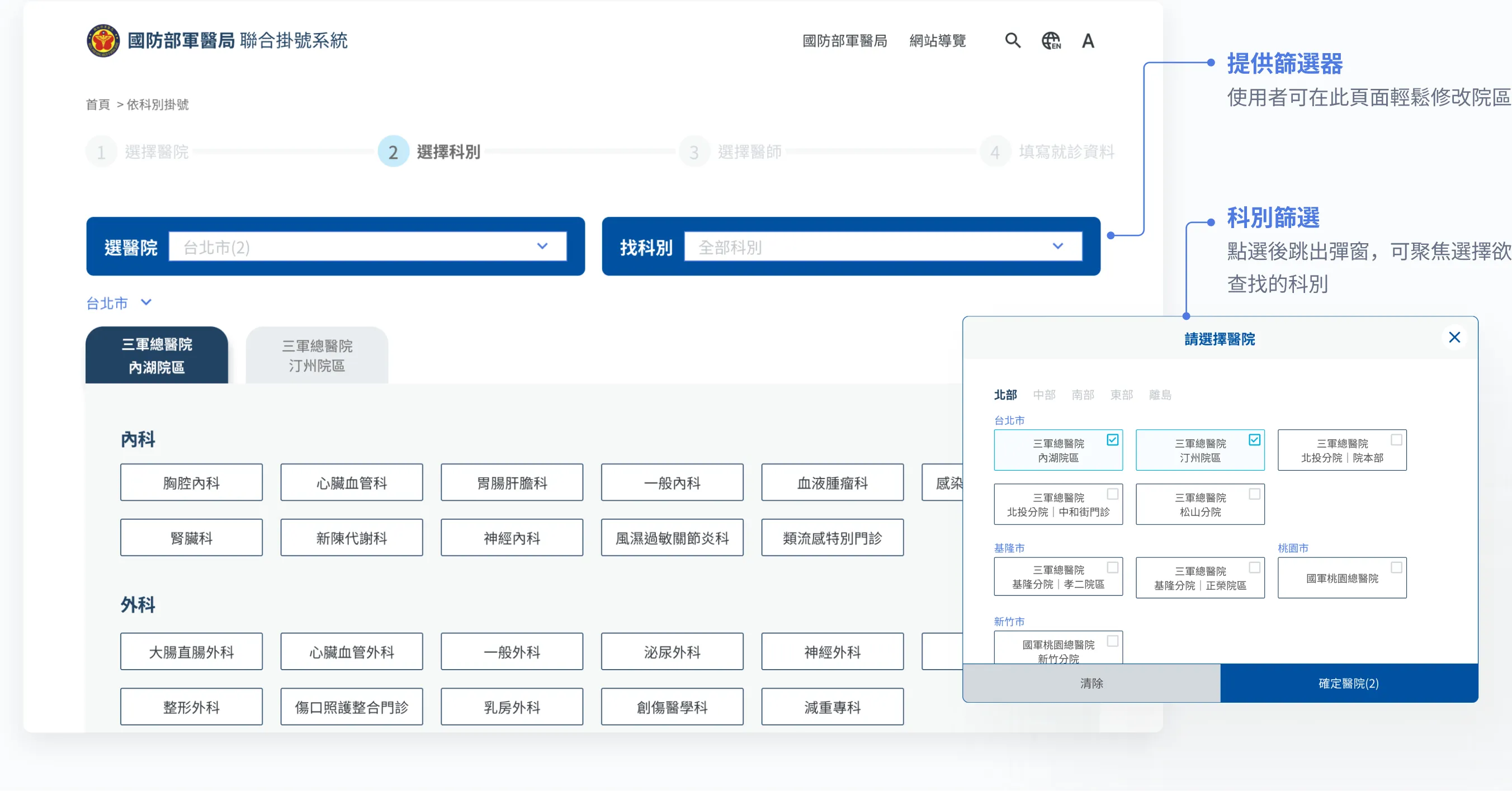 我將第一步「選擇科別及選醫院」的流程邏輯進行拆解,以使用者最在意的「距離」為依據,讓使用者先專注選擇與自身距離近的院區,再進行下一步的科別選擇。同時,考慮到國軍醫院的命名相似性及分區分院情況,我將選擇過程切分為「地域選擇 ➜ 縣市判斷 ➜ 地址區域」,以幫助使用者快速決策,避免混淆。